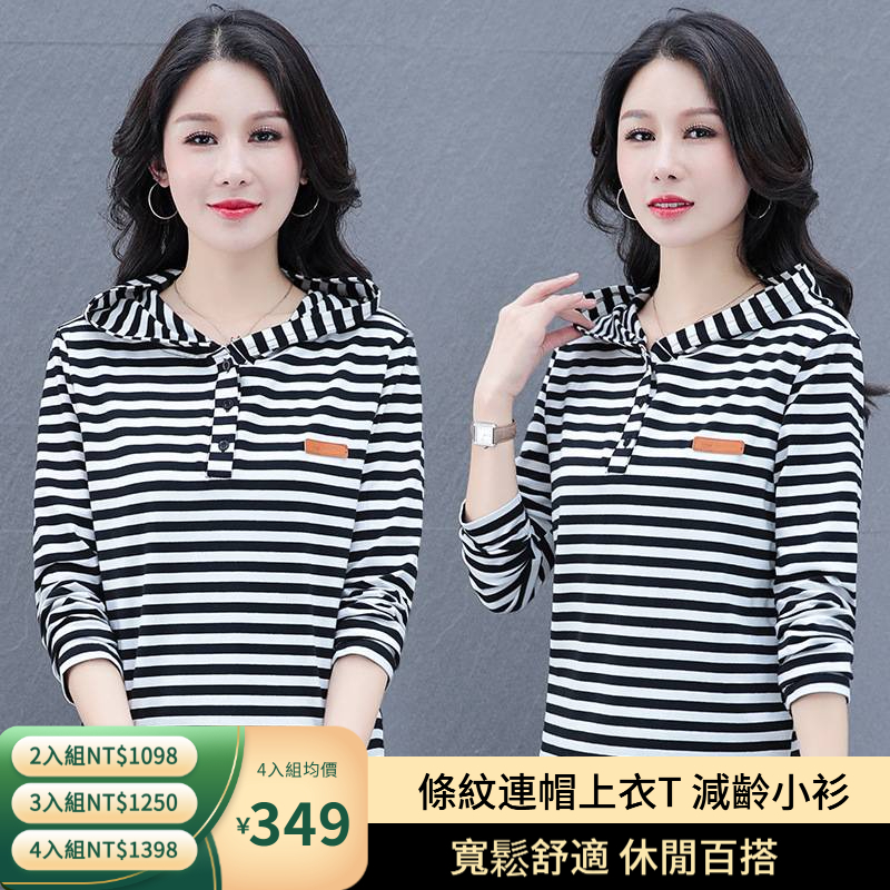 【買一送一】條紋連帽上衣,面料柔軟舒適,不挑身材,不挑年齡,寬鬆不顯胖,穿上超好看!百搭實穿 單穿 內搭攏總宜